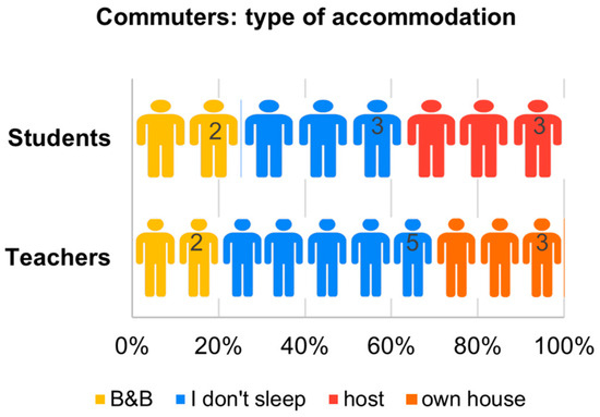 Commuter students stayed with hosts (about 37%) or in a bed and breakfast (25%), but over 37% never stayed overnight. Among professors, 33% owned a house where they stayed, but over 44% never stayed overnight. The rest opted for temporary accommodations, such as bed and breakfasts (Figure 5).