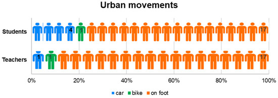 Students and professors preferred to move on foot in the city, although among students, a considerable number used cars (about 18%). Nobody used the city buses (Figure 7).