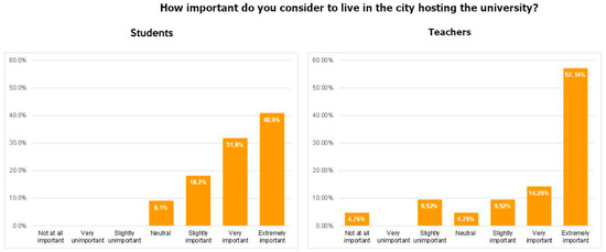 Although many students commuted, there was a prevalence of responses indicating the importance of staying in the city during the study experience. Similarly, for professors, there was also this clear prevalence, but the responses were more nuanced, with some indicating that living in the city for those who taught was of little or no relevance (Figure 8).