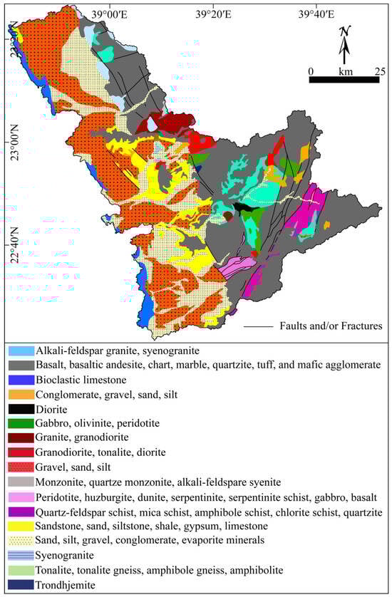Some structural contacts are recorded between different units. For example, sandstone, silt, siltstone, shale, gypsum, and limestone units join gravel, sand, and silt unit by a NW–SE lineament. The same contact trend was recorded in the south part of the study area between (1) sandstone, silt, siltstone, shale, gypsum, and limestone units and volcanic units represented by basalt, and (2) sedimentary units made up of gravel, sand and silt units and peridotite, harzburgite, dunite, serpentinite, gabbro, and basalt. For more details about the geological framework of the study area, see Figure 2.