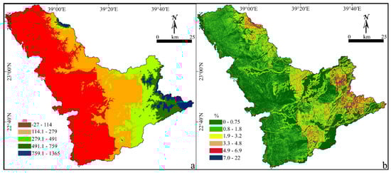 Topography of the study area surface varies due to the morphological characteristics, and this is reflected in the area topographical signatures, which are known for their quick changes. This area is laterally changing from east to west, where it is observed that it varies from −27 m along the coastal line to 1365 m at the most western part of study area (Figure 3a). The sloping characteristics provide percentage values from 0 up to 29, and the highest values are concentrated at the western, southern, and northwestern parts, respectively (Figure 3b).