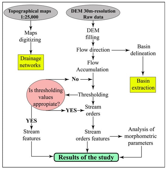 Drainage basins and/or sub-basins could be classified and ranked due to their importance according to process objectives. The authors of [31] applied this method in their work, explaining that prioritizing drainage basins is a technique for assigning water bodies into classes according to the degree of soil erosion and the drainage areas’ different conditions. Numerous related publications have examined how analysis of morphometric factors plays an important role in the drainage basin prioritizing process. For example, the author of [32] applied modern remote sensing and geographic information systems (GIS) techniques in examining drainage basin prioritization in Guhiya Basin in India; morphometric analysis was utilized by the authors in [33] to rank the nine sub-watersheds in the Piperiya watershed in order of importance for watershed management; authors in [34] define and discuss the drainage basins most vulnerable to soil erosion using morphometric analysis and prioritization in the Manot River catchment; the Dudhani River Basins in India were ranked due to soil erosion prioritization using powerful morphometric analysis [15]; the authors in [9] identified the soil erosion-prone regions of the Dabus watershed of the Blue Nile in Ethiopia using a combined technique of GIS and metamorphic analysis; the soil erosion vulnerability of the major Oued Amter Basin in northwest Morocco was assessed using morphometric and geospatial analysis [1]; and the authors of [2] applied morphometric analysis implications to the Rietspruit Sub-Basin in South Africa to assess the soil erosion susceptibility.