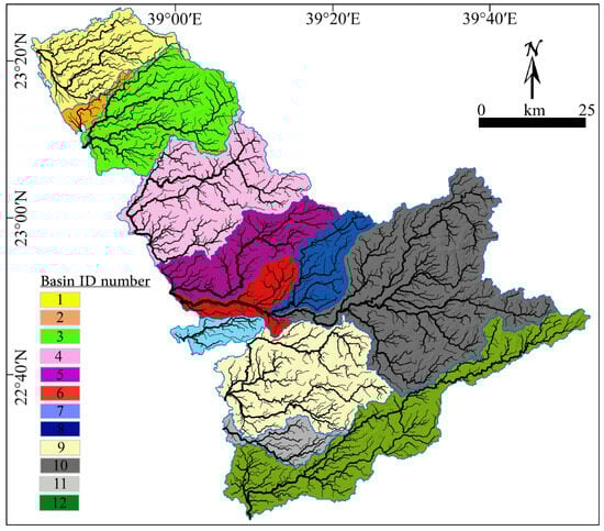 According to [49,50], the precise definition of a basin is necessary for the accurate identification of stream flow pathways and their contributing areas, which in turn is necessary for basin priority and its management techniques. In the present study, the stream network generation from DEM revealed a notable spatial deviation from ground truth, particularly close to the basin outlet. It takes a lot of time and work to perform morphometric analysis on the digital drainage network. Even with the aid of sophisticated computing tools like ArcGIS, processes like stream ordering for each segment, its naming, and merging and dividing stream segments at suitable locations take a long time [6,51]. The stream networks that emerged from the 12.5 m Alos PALSAR digital elevation model do not follow the actual natural river network. The original DEM was reconditioned and burned-in using the digital stream networks from the toposheets. Next, using Arc GIS hydrology tools, the restored DEM was utilized to draw the boundaries of the drainage network, stream order network, and watershed. The flow directions process in the study area was ascertained by using the eight directions flow direction technique. Water can move from one raster cell to its eight adjacent cells in accordance with this procedure. The algorithm determines which adjacent cell has the steepest downslope and based on the flow directions, assigns an integer code between 1 and 255. The Rabigh coastal area landscape was divided into 12 (from 1 to 12) different basins utilized greater than the fourth order (Figure 5).