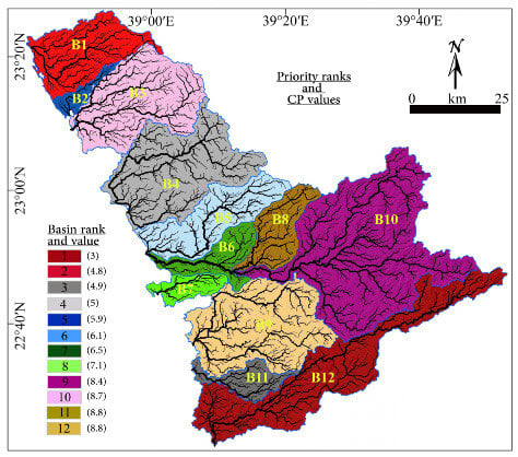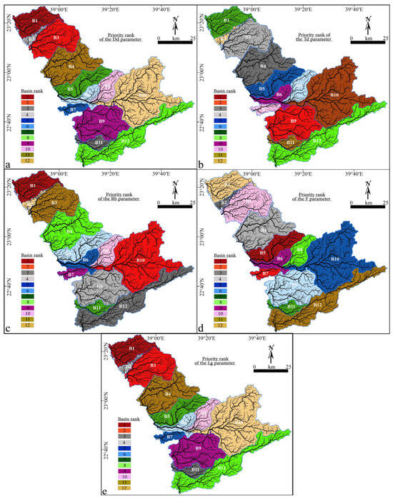 The 12 basins of the Rabigh study area were ranked from 1 to 12 based on individual morphometric parameters. For example, using the values of the drainage density (Dd) parameter, the basins were ranked as follows: Basin 1, Basin 4, Basin 2, Basin 11, Basin 7, Basin 6, Basin 5, Basin 10, Basin 9, Basin 12, Basin 3, and Basin 8, respectively (Table 4). The same ranking strategy was applied for the other morphometric parameters. Table 4 presents the rankings for each parameter. The compound values for the basins, ranging from 1 to 12, are as follows: 4.8, 5.9, 8.7, 5.0, 6.1, 6.5, 7.1, 8.8, 8.8, 8.4, 4.9, and 3.0, respectively (Table 4). Based on these compound values, the basins were prioritized from rank 1 to 12 as follows: Rank 1: Basin 12; Rank 2: Basin 1; Rank 3: Basin 11; Rank 4: Basin 4; Rank 5: Basin 2; Rank 6: Basin 5; Rank 7: Basin 6; Rank 8: Basin 7; Rank 9: Basin 10; Rank 10: Basin 3; Rank 11: Basin 8; and Rank 12: Basin 9, respectively (Table 4).