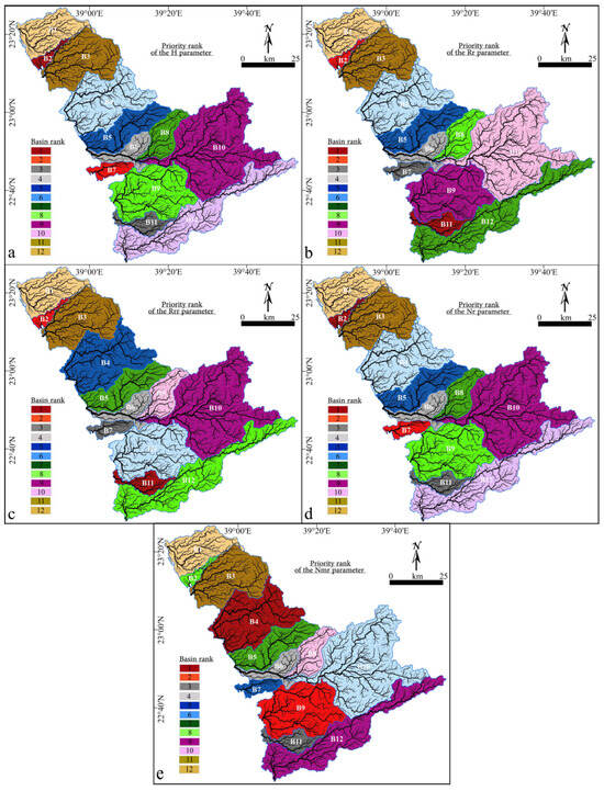 Priority ranking maps of the relief parameters applied in the present study including (a) basin relief; H), (b) basin relative ratio; Rr), (c) relative relief ratio; Rrr), (d) ruggedness number; Nr), and (e) Melton ruggedness number; Nmr).