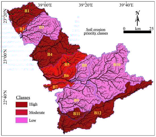 In the present study, the 12 basins were ranked from 1 to 12 according to the analysis of the applied morphometric parameters. Authors in this work suggest scaling the ranks or levels from 1 to 12 as the highest and lowest levels of soil erosion priority according to the compound value. Therefore, we could say a basin with a rank of 12 has the lowest level of soil erosion priority; a basin ranked 11 is more exposed to soil erosion than a basin with a rank of 12; a basin of rank 10 is more exposed to soil erosion than a basin of rank 11; and so on (Table 4 and Figure 8). This work selected this strategy because no standard values of these ranks have been applied before. Although some authors classified ranks according to various values, none gives reasons for choosing these values of classification. For example, authors in [9] classified Dabus watershed into four classes based on compound values as very high (≤5.5), high (5.5–6.51), medium (6.51–7.5), and low (≥7.5). On the other hand, some authors such as those of [11,76] divided the upper basins and Didessa and Jema Basins into three categories: high, medium, and low. These categories were based on compound values of ≤6.5, 6.5 to 7.5, and ≥7.5 and ≥2.55, 2.55 to 3.55, and ≥3.55, respectively. Therefore, we can clearly see that the ranges of priority classification could be different from area to area and from study to study. The highest rank of the compound value strategy in the Rabigh area is 3, which was recorded for Basin 9 (Table 4 and Figure 8). Additionally, and to put results in a precise scale, the present paper assigns the 12 ranks into three levels of soil erosion risk levels. Each class comprises four ordered ranks. A high level of soil erosion priority indicates basins that are highly exposed to erosion risks (basins ranked from 1 to 4), a moderate level of soil priority covers basins that are moderately exposed to soil erosion risk (basins ranked 5, 6, 7, and 8), and finally, a low level describes the last four basin types in the original rank scale (basins ranked from 9 to 12). Figure 9 presents the map of soil erosion priority classes.