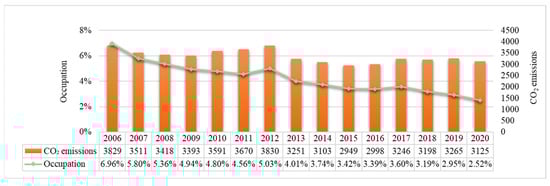Figure 1 depicts the CO2 emissions of the Chinese rail system from 2006 to 2020. The CO2 emissions of the rail system have been gradually decreasing, which can be attributed to the increased use of electric locomotives. In terms of the percentage of CO2 emissions, the CO2 emissions generated by the rail system approximately account for XXX% of the total CO2 emissions from transportation as a whole.