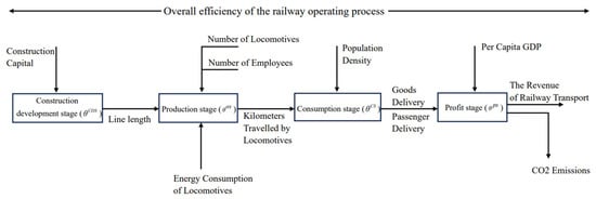 As shown in Figure 3, due to the characteristics of the muti-stage railway system, the railway bureaus  in the railway transport system were considered as individual decision-making units (DMUs). In order to accurately analyze the reasons for the inefficiency of railway operations, we divided the railway operation sector into construction development, production, consumption and profit. In this paper, for the construction development stage, we selected construction capital as the input to produce line length; for the production stage, the railway bureaus adopted the output of the first stage (line length), and the number of locomotives, the number of employees and the energy consumption of locomotives were selected as the inputs, so as to produce the kilometers travelled by locomotives; for the consumption stage, the output of the production stage—kilometers travelled by locomotives—was taken as an input and produced goods delivery and passenger delivery; for the profit stage, the railway bureaus produced two outputs, a desirable output—the revenue of railway transport, and an undesirable output—CO2 emissions. Additionally, we selected two environmental variables (population density and per capita GDP) as inputs of the consumption stage and profit stage, respectively.