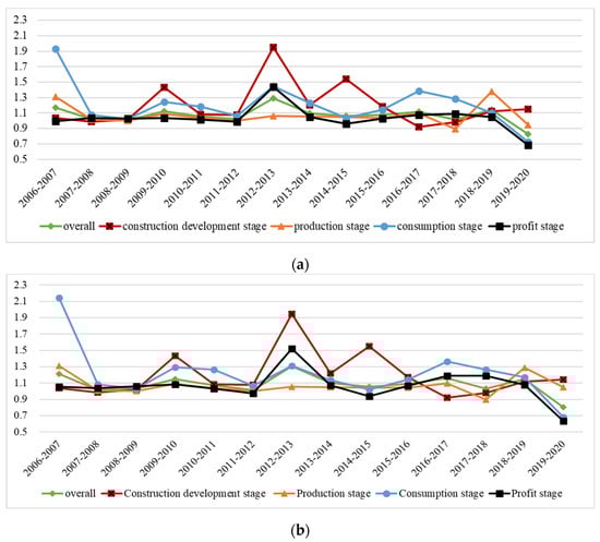 Second, for Model 1, the TFP in the consumption stage consistently outperformed that of the profit stage, except in the specific period of 2008–2009. The construction development stage recorded an impressive average annual TFP of 1.1921, signifying a 19.21% growth rate, while the production stage reflected a more modest TFP of 1.069, translating to a 6.9% increase annually. Figure 4a shows that with the exception of 2018–2019, the trend of the TFP in the consumption stage was the same as the overall trend, and the former was higher than the latter during 2006–2014 and 2015–2018. In 2017–2018, the TFP in the construction development stage and production stage was less than 1 (0.984 and 0.897), indicating a decrease in the TFP, while the same phenomenon occurred in the consumption stage and the profit stage of 2019–2020, when the TFP was 0.728 and 0.686, respectively. The decline in the TFP may be related to the COVID-19 pandemic or to travel restrictions related to the outbreak of the virus. Thus, the data suggests a significant correlation between declining TFP and the disruptions caused by the pandemic in the respective stages of the economy.