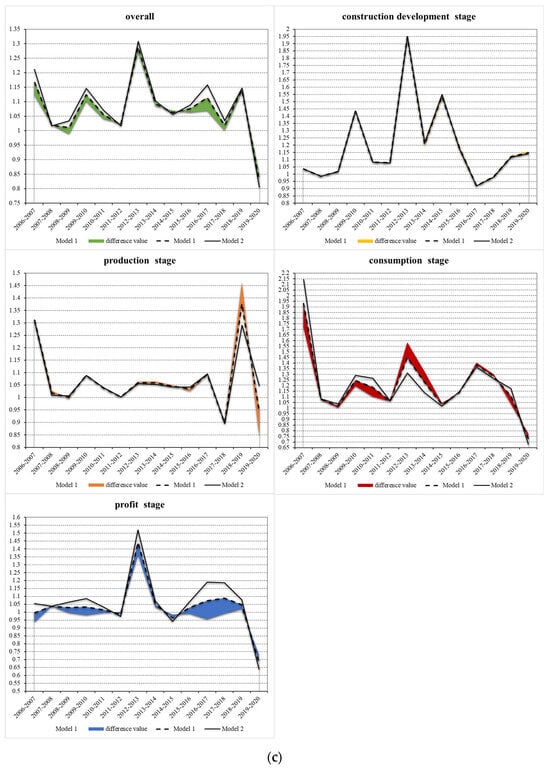 In summary, Figure 4c displays that after adding an undesirable output, that is, CO2 emissions, by observing the difference between Model 1 and Model 2, both the overall efficiency and the efficiency of each stage were negatively affected by CO2 emissions during 2006–2020. However, the negative effects of CO2 on the construction development and production stages were much lower than on the consumption and profit stages.