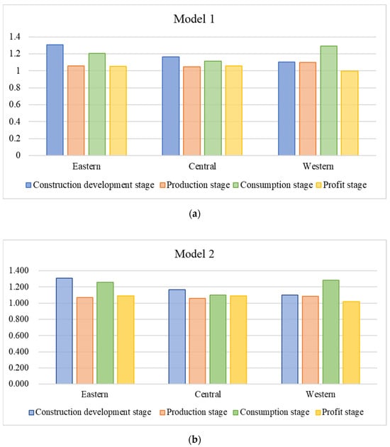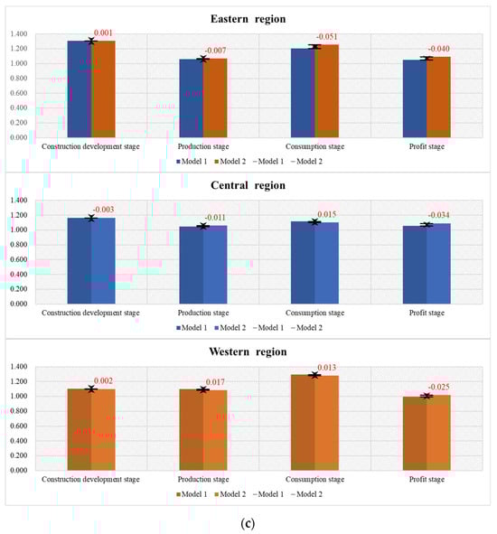 To summarize, by observing the difference value in the eastern, central, and western regions shown in Figure 5c at different stages, we found that CO2 emissions negatively impacted various stages: the construction and development stage in the central region, the production stage in both the eastern and central regions, the consumption stage in the eastern region, and the profit stage in the eastern, central and western regions.