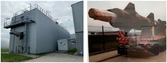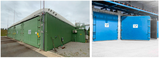 Percolation fermentation reactor in Eggersmann technology, located in Enger, Germany (left), and Poznań, Poland (right). Installation capacity: Enger 6000 Mg/year, Poznań 30,000 Mg/year; mesophilic fermentation (42–43 °C), single-stage process (source: own data). In both cases, the percolate tank is located underground. In the compact technology (left), the biogas tank is located on the roof of the facility.