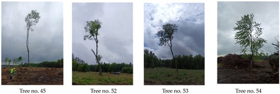 The next fieldwork stage consisted of the felling of the investigated trees, measuring their length, and extracting the stumps with the root systems. For this purpose, one of the machines working in the quarry was used—a backhoe and loader with a size and loading capacity adopted to the size of the root balls. Its size made it possible to extract the stump’s main part intact. Roots outside the range of the backhoe, broken from the main stump, were dug out using an excavator and transported to the site, where they were cleaned to reconstruct the entire root system.
