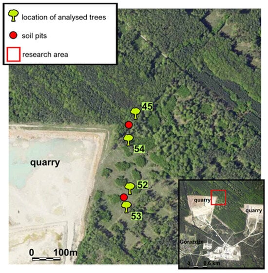 The authors would like to express their sincere thanks to Monika Szafranek, for her invaluable cooperation during the in situ studies conducted at the Górażdże Quarry and to Tomasz Czerniak, for his priceless contribution to the preparation of professional graphic visualizations of the tree root systems for our paper. Expressions of gratitude are also addressed to the technical staff team of the Bureau of Forest Management and Geodesy—Branch in Brzeg for their fruitful fieldwork within the framework of this project.