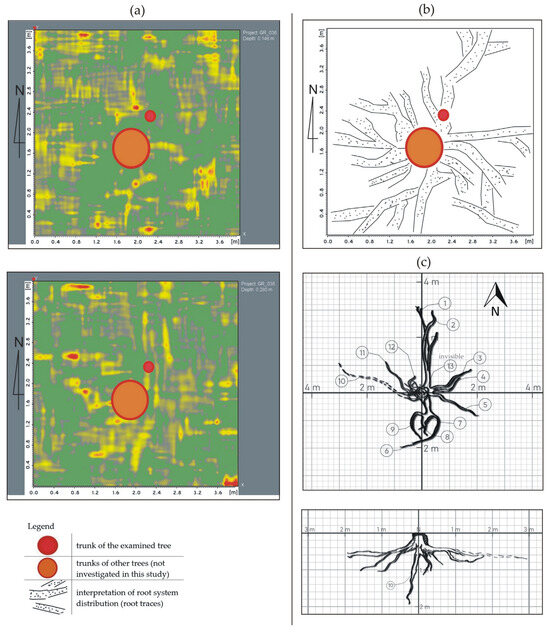Tree no. 53. GPR time-slices at depths of approx. 18 and 30 cm (a); Interpretation of the root system distribution derived from 3D GPR model in the depth interval of 20–40 cm (b); Horizontal and lateral view sketches of the reconstructed stump made manually in situ. The numbers refer to the detailed in situ analysis of root diameters listed in Table 10 (c).