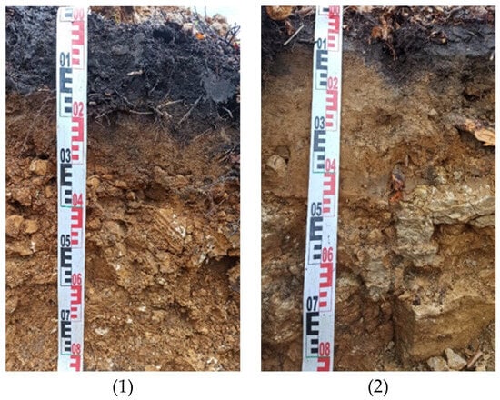 A characteristic feature of soil in the study area, evident in the soil profile (see Figure 8), is connected with the very shallow location of the parent rock. Weathered clay, together with dense limestone debris, was observed already at a depth of 20–30 cm both in exploratory pits excavated specially for the soil profile, and in other places, e.g., in holes dug to remove stumps of wild service trees. In places, the roof of the limestone layer was found at a slightly greater depth (approx. 50 cm), which resulted from the fact that it is a surface exposed to erosion and it is strongly weathered. In the examined outcrops, the humus horizon (A) reached a depth of as little as several centimetres to approx. 20 cm. The eluvial horizon (Eet), as well as the illuvial horizon (Bt), were also identified, but they were of a markedly reduced thickness of only several cm. In the investigated soils in the A horizons, the grain size distributions of clayey sands and sandy clays were also identified. The Eet horizon was composed primarily of clayey sands, the Bt horizon was composed of loams, while the parent rock horizons (C) were characterised by the dominant limestone rock fragments (fractions of stones and pebbles) surrounded by sandy clay loams, which in combination formed a deposit with a very high share of stone fragments—being clayey-stone.