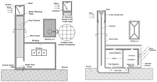 - Bahadori, M.N. An improved design of wind towers for natural ventilation and passive cooling. Sol. Energy 1985, 35, 119–129. [Google Scholar] [CrossRef]