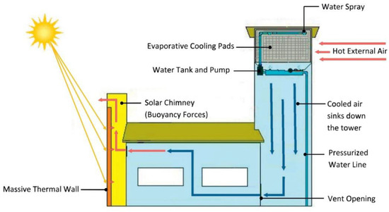 - Jafari, S.; Kalantar, V. Numerical simulation of natural ventilation with passive cooling by diagonal solar chimneys and windcatcher and water spray system in a hot and dry climate. Energy Build. 2022, 256, 111714. [Google Scholar] [CrossRef]