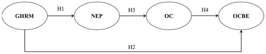 The core of this research paper is to explore the mediating role of NEP between GHRM and OCBE. NEP provides the cognitive framework that links the environmental practices promoted by GHRM to the voluntary pro-environmental behaviors (OCBE) exhibited by employees. The NEP fosters a deep-seated understanding of the interconnectedness of human and ecological systems, which in turn motivates employees to engage in OCBE. Therefore, by enhancing NEP through GHRM practices, organizations can effectively bridge the gap between formal environmental policies and voluntary employee behaviors that support sustainability. This mediating role is crucial as it highlights the indirect pathway through which GHRM can influence OCBE, making NEP a key lever in the overall strategy for promoting environmental responsibility within organizations [28,30].