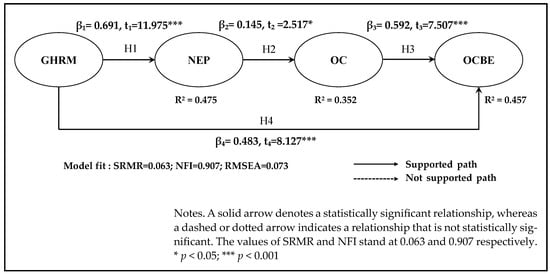 The CB-SEM method was employed to explore the statistical significance of the sequential mediating roles of NEP and OC in the relationship between GHRM and OCBE. The results indicated that NEP and OC partially mediate the connection between GHRM and OCBE among hospitality employees. As shown in Table 3, the sequential mediation effect of NEP and OC between GHRM and OCBE is quantified at 0.239 (t = 7.336, p < 0.001). Furthermore, the 95% confidence intervals do not include zero, suggesting that the null hypothesis regarding the mediating roles of NEP and OC cannot be supported.