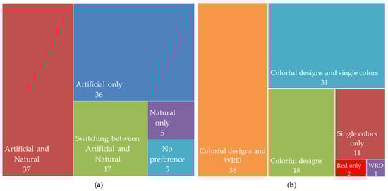 The adoption of an environmentally conscious lifestyle and behavior is fundamental for transitioning towards sustainability [40,41]. The preference for more natural products is multilayered and depends on the type of the product, familiarity, packaging, price and labeling, among others, and consumers could opt for certain products according to their socio-demographic and economic traits, as well as cultural upbringing [42]. About half of our participants (54%) used natural dyes but most of the time also with artificial ones (37%, Figure 1a). Those who rely only on artificial dyes (36%) usually buy ready sets of four to seven colors from convenience stores and supermarkets. Very few preferred exclusively natural colorants (5%), and about the same percentage did not express any preference (5%). Similarly, few participants preferred to dye in single primary colors or in red only at 1% and 2%, respectively (Figure 1b). According to the participants, combinations of colors and designs were considered modern, interesting and artistic, as well as allowing more engagement for younger children who have not mastered precise drawing. Practicing only the traditional wax-resistant drawing technique was cited quite seldomly as well (1%), probably due to the same reason.
