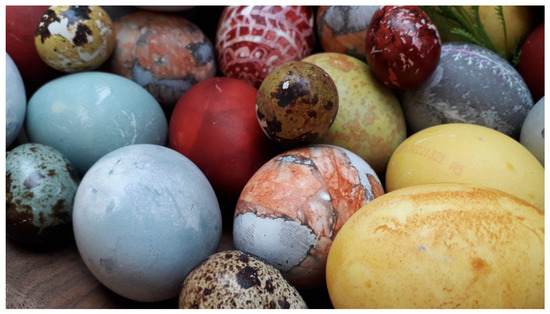 One of the fascinating food coloring traditions in Europe are Easter eggs, which, for instance, in Bulgaria, Germany, Greece, Romania, Poland, Ukraine, United Kingdom, etc., involve dyeing whole boiled eggs that are consumed after the so-called egg fights or egg tapping [19,20,21,22,23]. Easter eggs are often consumed from a few days to several weeks after Easter and are not always stored in refrigerated conditions. Although, the intact eggshells provide some protection even after boiling and the destruction of the cuticle during the boiling, the porous palisade layer could allow not only secondary contamination but also infiltration of the used dyes. In Europe, traditional food coloration relies on limited biodiversity, with many coloring ingredients imported for centuries, unlike many Asian and native American cultures, for instance, where food coloration involves a large number of local plants, many of which are used as spices or participate in the preparation of ritual and festive foods as well [23,24,25,26,27,28]. Local knowledge on plant food colorants relies on respective biodiversity and socioeconomic factors. However, recent ethnobiological studies in Europe have shown considerable shrinkage of this knowledge among the general population [29,30].