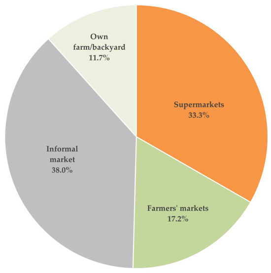 While eggs are among the products that pose the highest risks to consumers’ health and there are strict regulations to prevent the spread of avian infectious diseases in Europe, certain risky behaviors and preferences are spread among consumers [87,88]. Approximately 38% of our respondents source eggs from informal markets, followed by supermarkets (17.2%), and only 11.7% had their own hens (Figure 4). Informal markets involve obtaining eggs from relatives and friends, buying from neighbors with backyard hens, etc., where the safety conditions could vary considerably [87].
