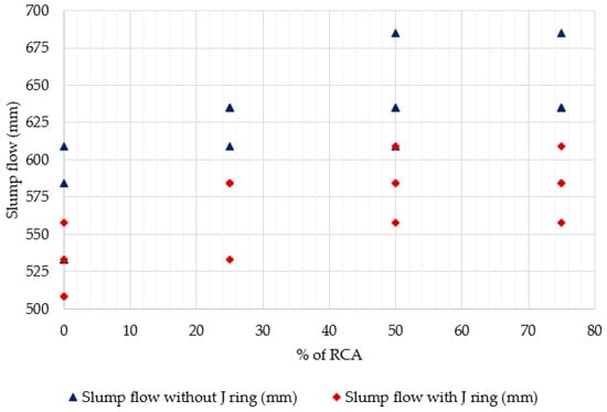 Increasing the proportion of fine RCAs in the SCC decreased the flowability and passing ability. In addition, there is a significant effect of the fine RCAs on the J-ring experiment compared to the slump flow experiment. However, this slump value satisfies the EFNARC standard []. Enhancing the substitution of NCAs from 20% to 60% by RCAs results in a significant increase in the viscosity of the SCC []. The V-funnel and L box blocking proportions of SCC, with a high dosage of RCAs above 50%, resulted in classes VF1 and PA2, as per EFNARC standards [,]. On further investigation by Singh and Singh, 2018 [], the deformability of the SCC was measured by a U box experiment and was within the satisfactory range of 0–30 mm. From Figure 3, it is noted that the effect of RCAs on the slump flow with and without a J ring. An observed correlation exists between an increase in RCA dosage and an increase in slump flow [].