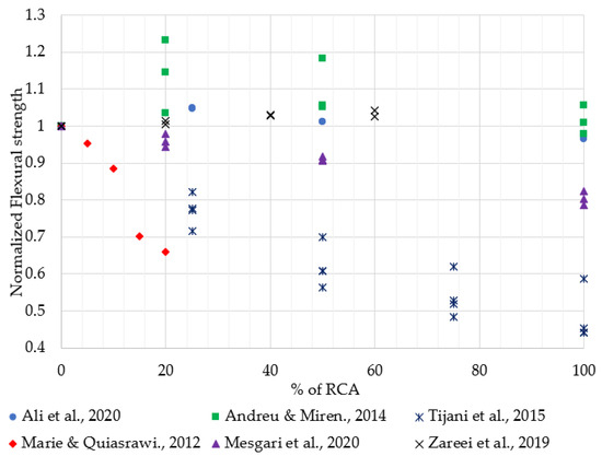 An increase in the dosage of RCAs results in a decrease in flexural strength, which is compensated by the use of a ternary mixture of SCM along with fibers, as reported by Ahmed et al., 2023 []. A decrease in FS with an increase in RCA content was reported by Mohammed and Najim, 2020 []. This is due to the weaker RCA strength compared with NCAs, in the addition to the bonding between the surface of RCAs and the new mortar. This leads to the initiation of microcracks at points that accelerate the distribution of microcracks to cracks within the ITZ. The STS and FS of SRC are enhanced when RAC arrives from the higher CS of SCC []. The behavior of STS and FS was reported by Fiol et al., 2018 []. Figure 8 indicates that an increase in the dosage of RCAs results in a decrease in the normalized FS as reported by Mesgari et al., 2020 [], Marie and Quiasrawi, 2012 [], and Tijani et al., 2015 [], whereas the researchers like Andreu and Miren, 2014 [], Ali et al., 2020 [], and Zareei et al., 2019 [] reported that an increase in the dosage of RCAs results in an increase in the normalized flexural strength.