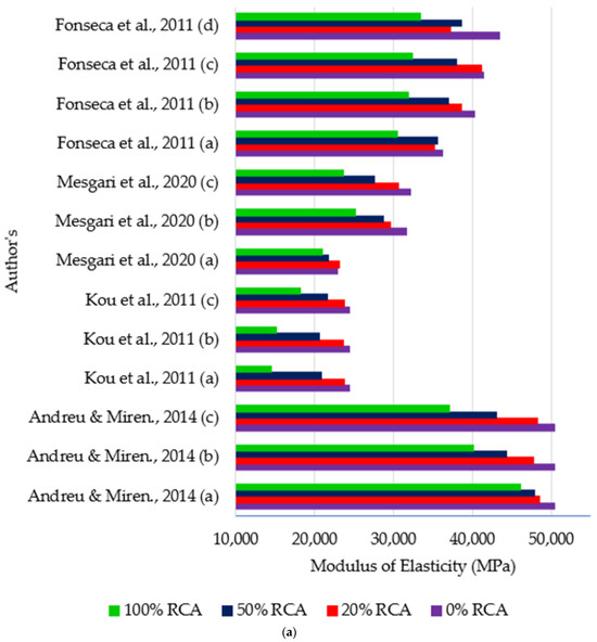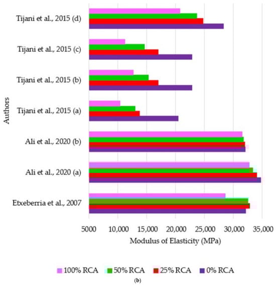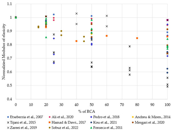 Effect of RCA proportion on the modulus of elasticity SRC at 28 days [,,,,,,,,,,].