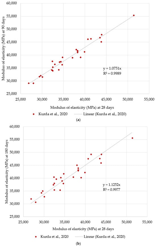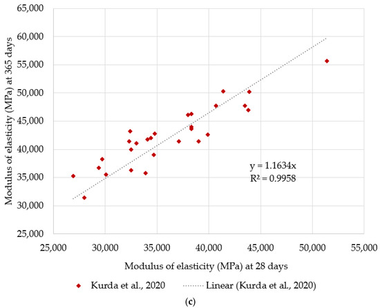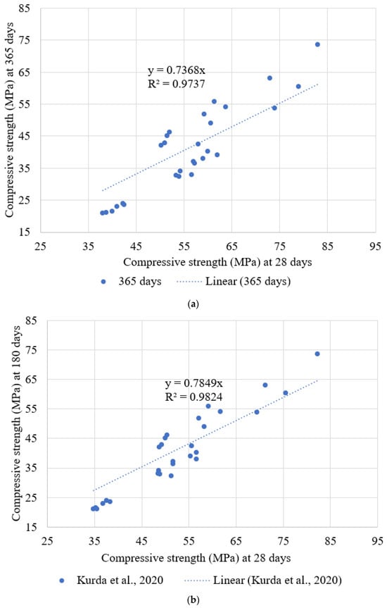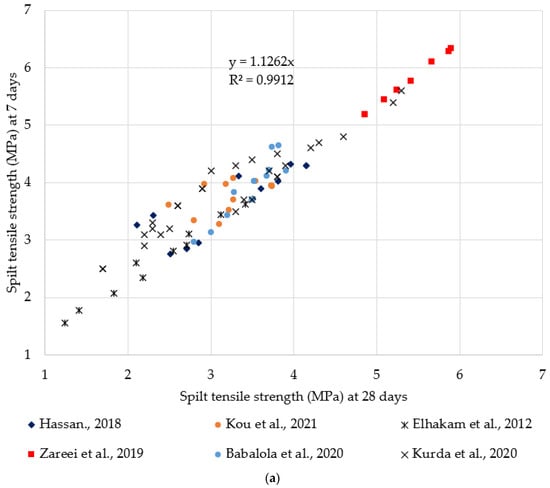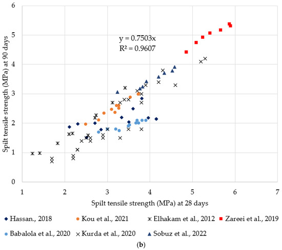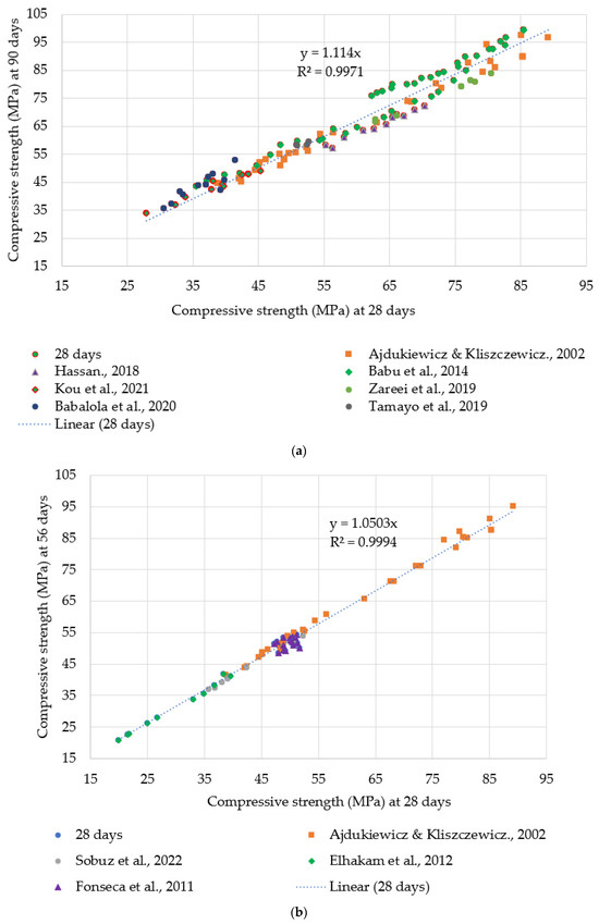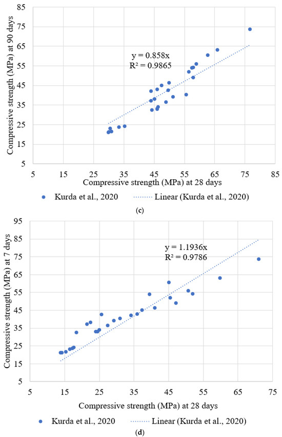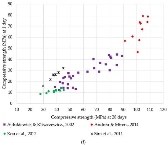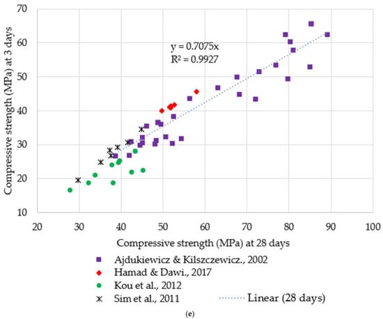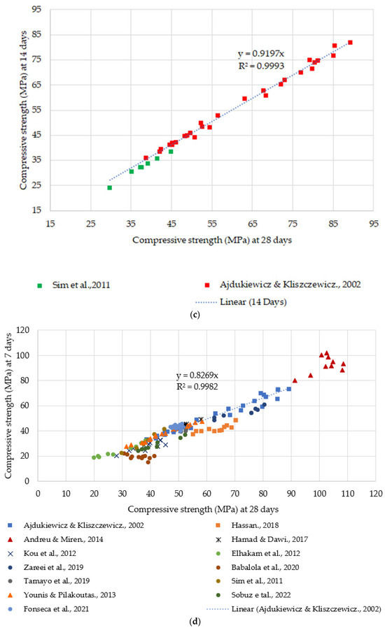 It is necessary to identify the relationship among the CS on days 28 and other curing period days. This may lead to many advantages for engineers and academicians like time savings, materials saving, and cost reduction. From Figure 10a, it is noted that the relationship among the cylinder CSs at 28 and 90 days is depicted in Equation (1) with the help of several studies ([,,,,,,]), which is noted as R2 as 0.96, whereas, from Figure 10b, the relationship among the cylinder CS at 28 and 56 days is depicted in Equation (2) with the help of several studies ([,,,]), which is noted as R2 = 0.99. The relationship among the cylinder CS at 28 and 14 days is depicted in Equation (3) with the help of several studies ([,]) which is noted as R2 = 0.99 in Figure 10c. The relationship among the cylinder CS at 28 and 7 days is depicted in Equation (4) with the help of several studies ([,,,,,,,,,,,,]), which is noted as R2 = 0.99 in Figure 10d. The relationship among the cylinder CS at 28 and 3 days is shown in Equation (5) with the help of several studies ([,,,]), which is noted as R2 = 0.92 in Figure 10e. From Figure 10f, it is noted that the relationship between the cylinder CS at 28 days and 1 day is depicted in Equation (6) with the help of several examples from literature [,,,]), which is noted as R2 as 0.96.