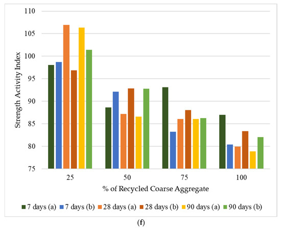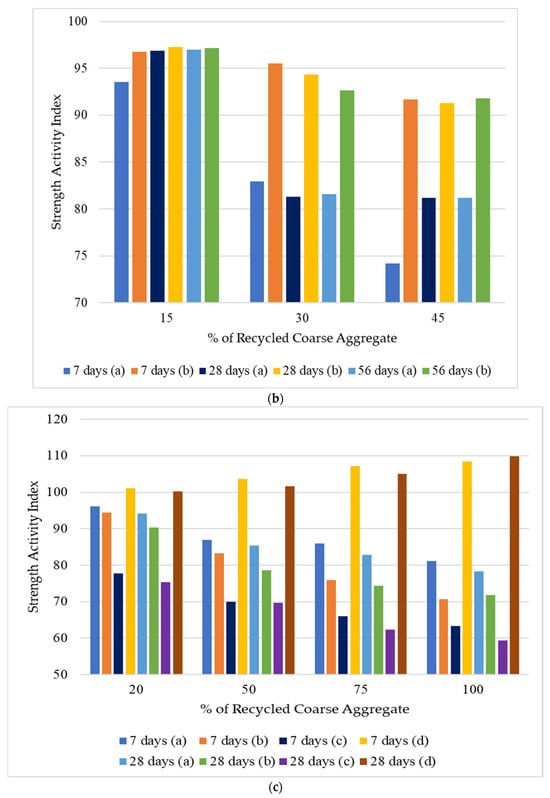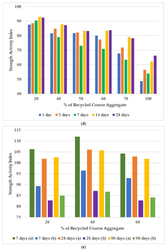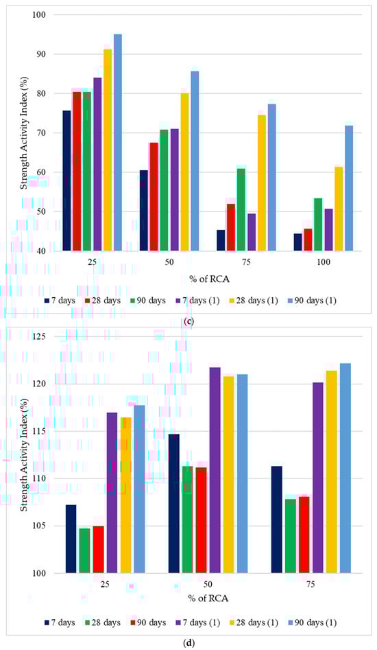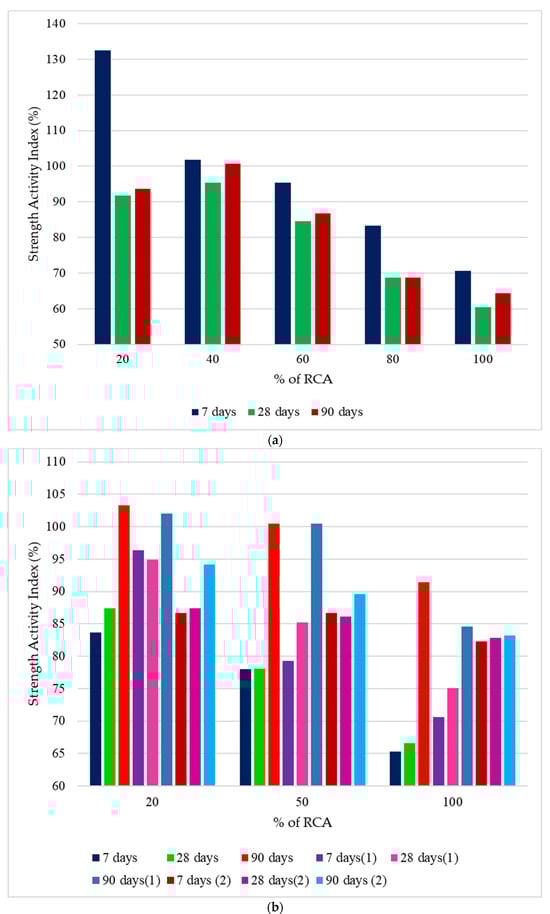 (a) Effect of RCA proportion on the normalized STS of SRC at 7 days. (b) Effect of RCA proportion on normalized STS at 28 days [,,,,,,,,,,,].