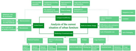 The current problems of urban furniture at the sustainable level include poor user experience, lack of local culture, irrational utilization of resources, inconsistent environmental landscape, and single function of facilities [6,7,8,9] in Figure 1, which affect the process of building sustainable cities and communities and therefore need to be solved urgently. The diversified needs of residents as the main users of urban furniture in the community can provide suggestions for the sustainable renewal of urban furniture in the community [10]. For example, in the community workshop, Yanling Zhang [11] learned from residents’ interviews and behavioral analyses that public seating material experiences are poor and that multiple seat heights can be reasonably used to accommodate a variety of activities for residents. Gu, SM [12], in his study, interviewed multiple user groups about cultural construction, analyzed the intrinsic needs of the public groups to assess the renewal of the cultural district from the public’s point of view, and compiled optimization suggestions. W Zou [13], in his research, extracted the cultural combination of creative points through the form of design practice for the traditional culture of Shanghai-style furniture and modern characteristics of the combination, from the user’s point of view. Yifan Wu [14], in his study, pointed out that community public facilities need to take into account the needs of the elderly and the young and realize functional composites to facilitate the leisure integration of the elderly and the young. Macke, J [15] analyzed the results of citizen interviews and determined that public services are one of the factors affecting a sustainable city and that the interactivity of public facilities is valued by residents. It can be seen that existing research has been looking for solutions to the above urban furniture problems from the user perspective [11,12,15], aiming to satisfy users’ needs through optimization of the functional and experiential layers in order to increase the usage rate.