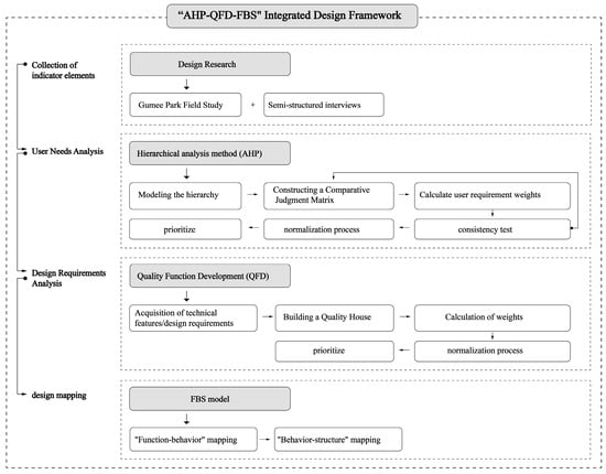 The research is based on design research, and through the integrated design methodology, the user’s perceptual needs are transformed into the design language in the form of quantitative data to improve the identification of user needs and the rigor of the design process to maximize the utility of the product [47,48]. The research framework of this paper is shown in Figure 2. The design research adopts the combination of field research and semi-structured interviews to collect the existing problems of public facilities in community parks and user needs and summarize them into user demand indicators. In the stage of user demand analysis, the AHP hierarchical model is established based on user demand, the comparative judgment matrix is constructed, the user demand indicator weights are calculated, and the indicator weights are tested for consistency to ensure the validity of the weights. In the stage of user demand analysis, the AHP hierarchical model is established based on user demand, a comparative judgment matrix is constructed, user demand indicator weights are calculated, the indicator weights are consistently checked to ensure the validity of the weights, and normalization is performed to obtain the comprehensive weights to expand the priority ranking of the user demand indicators. In the stage of design demand analysis, the user demand and the characteristics of the design object are summarized as the design demand, which are combined with the user demand weights of AHP analysis to construct the quality house, the design requirement weights are calculated and normalized, the relative weights of the indicators are obtained, the design requirement priority ranking is obtained, and the important indexes of product design are obtained. In the design mapping stage, based on the FBS “function-behavior-structure,” we complete the process of mapping function to product design and obtain specific design points to build a complete design scheme.
