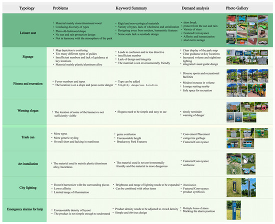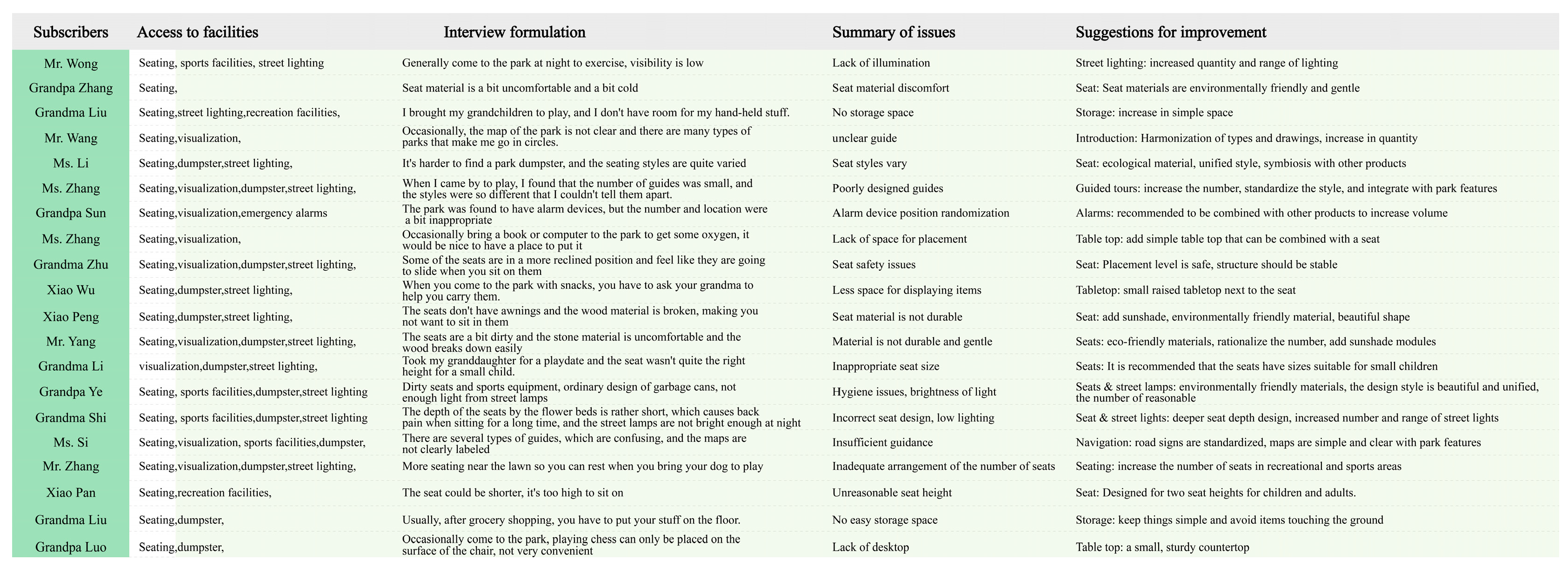Semi-structured interviews were conducted with 20 park users (Appendix A Figure A1), including 3 students, 8 middle-aged individuals, and 9 retired elderly people, the titles of the visits are listed in Table 1. The purpose of this interview was to obtain information about the utilization rate of the existing single product in the park and the corresponding problems from the perspective of the users of the community park. After summarizing and analyzing all the research results collected, it was found that the facility most frequently used by users was public seating. The needs of the interviewed users were categorized into nine groups: lighting requirements, clear pathways, convenient storage, cohesive design, comfortable experiences, distinctive aesthetics, ecological and environmental considerations, product integration, and thoughtful design.