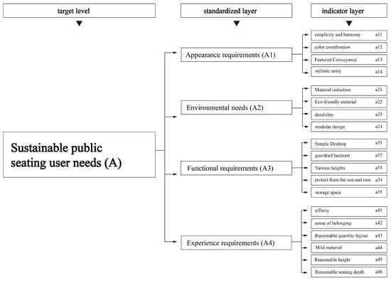 The results of the two user interviews were collated and analyzed, and the collected and summarized user requirements for public seating were constructed into a hierarchical structural model, which contains a goal layer, a guideline layer, and an indicator layer (Figure 4).