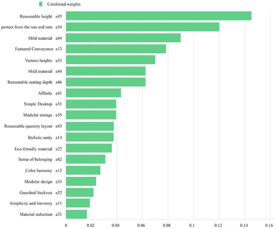 According to the research method in Section 2.4.1, firstly, the judgment matrix (Table 3) of the indicators in the user demand criterion layer of the Gumei Park public seat is constructed, and the weight values of the indicators are calculated by Equations (2)–(4). Secondly, the maximal eigenvalue is calculated by Equation (5), can be known by querying the reference table, and the consistency ratio is obtained by Equations (6) and (7). Therefore, the judgment matrix has consistency. The judgment matrix of the indicator layer calculates the weight value of each indicator in the same way (Table 4), the weight value is normalized to obtain the comprehensive weight, and the comprehensive weight is prioritized (Figure 5).