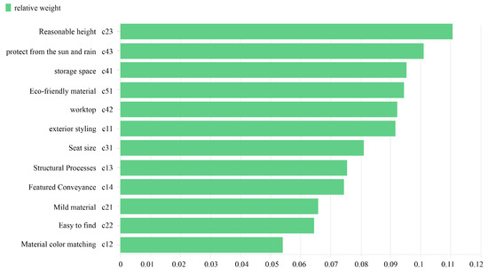 According to Equations (8) and (9) in Section 2.4.2, combining correlation rank and assignment (Table 6), the relative weights of the design requirements are calculated (Table 7), and the relative weights are prioritized (Figure 6). As can be seen from the design demand weights and prioritization model, the first indicator of the design weight ranking is highly reasonable, with a weight of 2.6736, which belongs to the first level of experience demand; followed by the indicators of sunshade and rain shelter and storage space, with weights of 2.4411 and 2.3031, respectively, which belong to the first level of functional demand; the fourth indicator of the weight ranking is the environmental protection demand, with a weight of 2.2837, which belongs to the environmental protection demand; the weight of modeling is 2.2124, which belongs to the first level of appearance demand; and the weight of seat size is 1.9596, which belongs to the first level of man–machine size. It can be seen that the order of the first level of design demand is experience demand, functional demand, environmental demand, appearance demand, and man–machine demand.