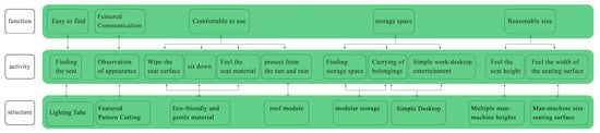 The Analytic Hierarchy Process (AHP) and Quality Function Deployment (QFD) methods are used to organize and analyze the data of user requirements and design requirements, obtaining the corresponding weights of the indicators and the priority of the indicators. After sorting, it is found that the experience requirements and functional requirements are more important. The weights of the second-level indicators related to seat height, sun and rain shelter, storage space, and feature communication are higher; with the help of the Function–Behavior–Structure (FBS) model, behavioral and structural mapping can be conducted for the functional indicators in the design requirements to identify specific design and structural keywords.
