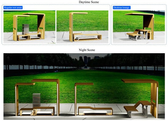 The modular shelving spaces, simple entertainment platforms, lighting overlays, top shading features, and multiple seating heights proposed in Section 3.5 can be categorized as user experience sustainability. Given the need for community urban furniture to meet diversified needs and take into account the differences in the leisure experiences of different user groups, the design should aim to create a public space environment that is both functional and comfortable to enhance the sustainability of the user experience. The “Modular Storage Space” suggests a reasonable increase in storage space in the facility to reduce the weight pressure on users. The “Simple Entertainment Platform” expands the functionality of public seating and promotes the diversity of recreation, work, and study. The “Lighting Functional superposition” requires the realization of the symbiosis of facility functions, and the combination of lighting and facilities not only identifies the user’s location but also increases the frequency of facility use. The “top shelter function” can provide shelter for residents throughout the day, avoiding the bad experience brought by unexpected weather conditions. “Multiple Seat Heights” use ergonomics to analyze the sitting heights of adults and minors from an all-age-friendly perspective to make height adjustments. Combined with the user’s needs, the four functions of storage, desktop, lighting, and sunshade are rationally integrated into the design of the public seat to realize the functional coexistence of the product, and two seat heights are designed at the same time to achieve sustainability at the level of the user’s experience.