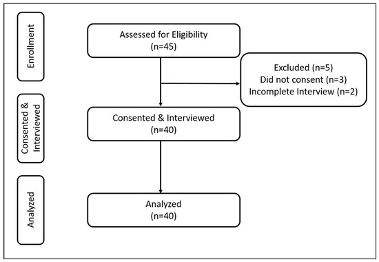 The results shown in Figure 1 show a sample size of 45 university students, of which 40 unique responses (88%) were included in this study. Five students were excluded due to incomplete interview or lack of consent.