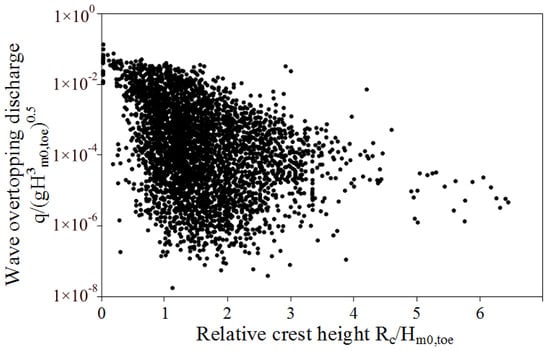 Dimensionless overtopping records for a range of relative crest heights tested within the CLASH dataset (adopted from [28]).