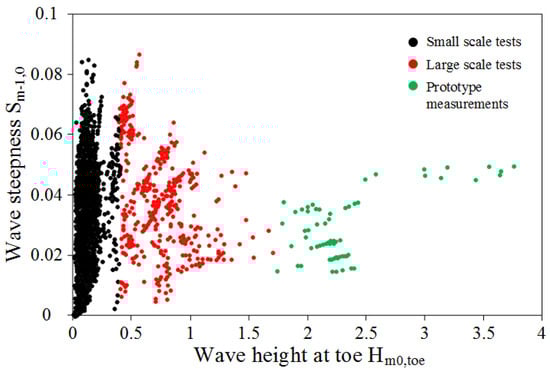 The range of wave steepness as a function of the wave height was determined for all the data and is presented in Figure 3. Wave steepnesses () exceeding 0.07 are physically unrealistic, while values lower than 0.005 are challenging to generate reliably in controlled conditions. Therefore, tests with or are considered unreliable and are excluded from further analysis in this study.