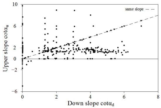 Figure 4 illustrates the combination of upper and down slopes for structures with and without berms. The majority of the tests involve uniform sloping structures. A negative upper slope corresponds to structures with a large return wall, while data with represent structures with a vertical upper section and a sloping lower section. Data points along the vertical axis correspond to structures with a vertical down slope and sloping upper section. Further analysis of the dataset reveals that most data points fall within the range of and .