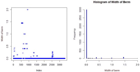 Scatter plot (left) and histogram (right) of ‘width of berm’ in the dataset with the highest level of reliability.