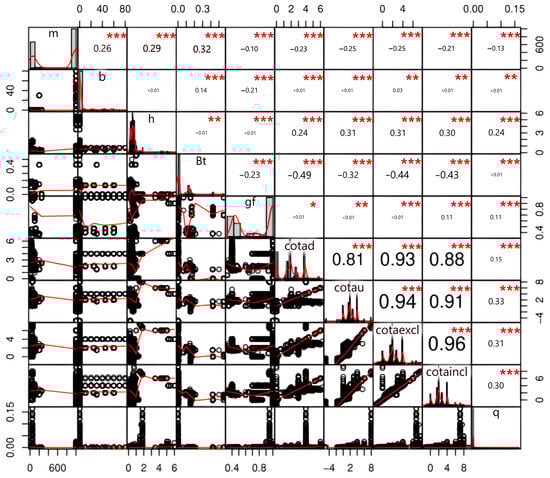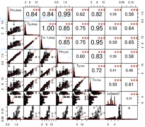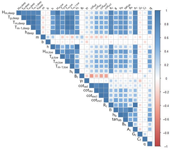 To identify the variables that are most influential on the overtopping parameter, the correlation coefficients between the input variables and the wave overtopping discharge parameter, q, were examined. Figure 6 illustrates the correlation matrix of these variables. Several strong positive correlations are apparent. For example, significant correlations are observed between , , and . In contrast, the correlations between and are very weak. Despite Figure 6 being useful for assessing the strength and direction of correlations between the input variables and q, it does not provide insight into the underlying functional relationships between the input parameters and q.