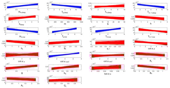 Figure 7 illustrates the scatter plots between several input parameters (mainly structural and geomorphological parameters, as listed in Table 1) and the wave overtopping discharge parameter, q. Due to space constraints, not all input parameters could be included in this figure. From the scatter plots and the computed correlations between each input variable and q, it becomes clear that the relationships between these variables and the wave overtopping discharge are highly non-linear. Moreover, some input parameters, such as or , exhibit distributions with multiple modes, suggesting that their relationships with q and even other input parameters defy interpretation via any known mathematical functional forms. Consequently, it would be misleading to rely solely on correlation coefficients for the SA of this complex, non-linear system, as highlighted by [40].