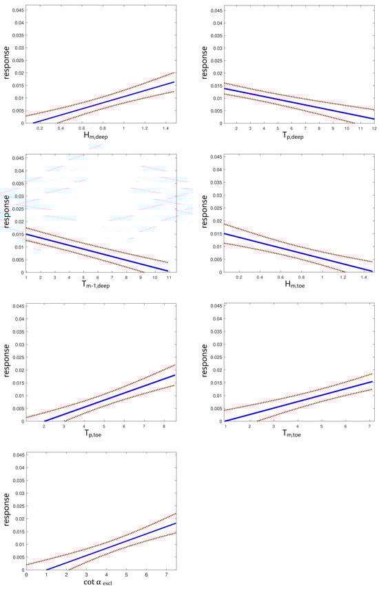 Figure 9 illustrates the estimated MEs, , where , defined in the general case in Equation (18), is an input parameter (detailed in Table 1). These MEs are approximated using the Gaussian process (GP) model as described in Section 4.2.2. This approach allows us to evaluate the sensitivity of the wave overtopping parameter with respect to individual input variables while maintaining computational efficiency and flexibility. To compute the SA measures reported in Table 2 and the MEs for each input parameter, the GP model was trained using only 330 high-reliability data points after cleaning the dataset, as described in Section 5.1.