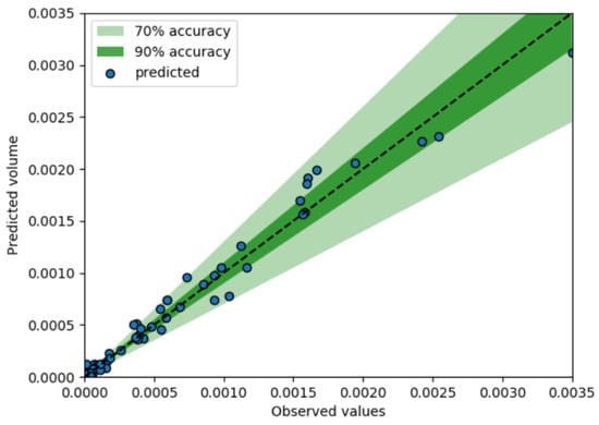 The results from the GP-based SA methods were leveraged to simplify and develop a robust predictive model for wave overtopping and coastal flooding based on the CLASH database. Figure 11 illustrates the initial results of predictive modelling for wave overtopping discharges from vertical defence structures (e.g., seawalls). The GP-based model demonstrates an efficient and reliable prediction of wave overtopping volumes, showing potential to outperform existing methods, such as those based on artificial neural networks, as reported in [38,39]. Additionally, due to the capability of GPs to make accurate predictions with far fewer data points, compared with ANNs, the proposed method allows for SA and modelling on smaller data subsets, enabling rigorous analyses, even with limited data availability.
