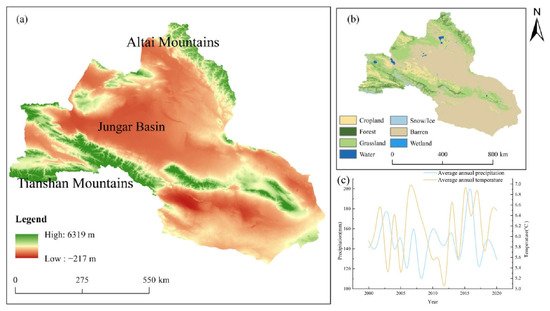 The study region is located in the northern part of Xinjiang, China, at 79°54′–96°22′ E, 42°08′–48°03′ N. The total area is approximately 440,000 km2 and the elevation ranges from around −210 to just over 6230 m. The region is mainly dominated by mountains and basins and includes the Junggar Basin, which is located between the Altai Mountains and the Middle Tianshan Mountains [25]. The terrain pattern has been described as “high in the east and low in the west”, forming a typical mountain-basin system [26]. Being situated far from any ocean, the study region has a typical continental arid to semi-arid climate, with a large diurnal temperature difference and an average annual temperature of −4–9 °C. These unique terrain conditions make the spatial distribution of precipitation uneven, coupled with the influence of the alternating effects of the Arctic Ocean air masses and westerly air currents [27]. Annual precipitation in the study region is about 160~300 mm (Figure 1) [28].